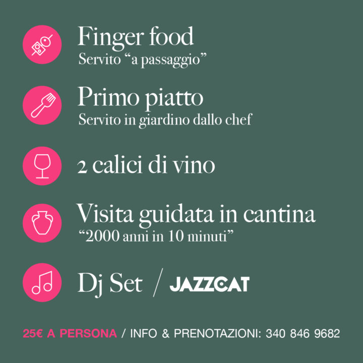 The proposals will be curated by the cuisine of the Gastronomic Space. A research cuisine that uses local ingredients offered in a gourmet key. DJ Massimiliano Conti, aka Jazzcat, will entertain guests in the winery garden among the vineyards and olive trees. Paired with the chef’s creations, of course, Feudo Antico wines.