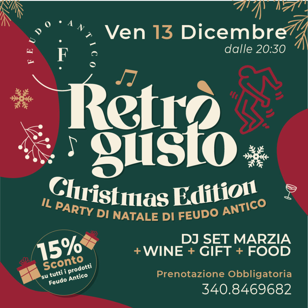 Dopo il grande successo di quest’estate torna la versione natalizia del super party di Natale targato Feudo Antico: “Retrò Gusto Christmas”. L’evento si svolgerà venerdì 13 dicembre dalle 20.30 alle 00.30. Il food sarà curato dallo chef Guido Brandito e il vino sarà naturalmente quello di Feudo Antico. Ad intrattenere la serata la musica del Dj Set Marzia Ferretti. Inoltre per tutta la durata del party sarà possibile acquistare i vini e i panettoni al 15% di sconto.